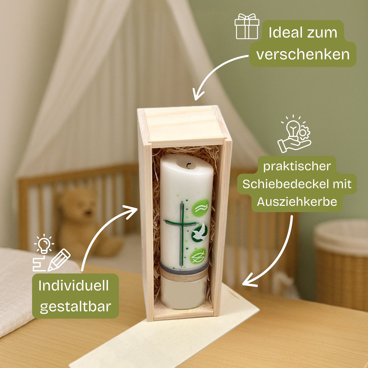 Present and gift your baptismal candle stylishly and safely – with our high-quality wooden box made of sturdy birch plywood. This elegant box with a practical sliding lid is specially designed for baptismal candles and optimally protects them from breakage and dust.